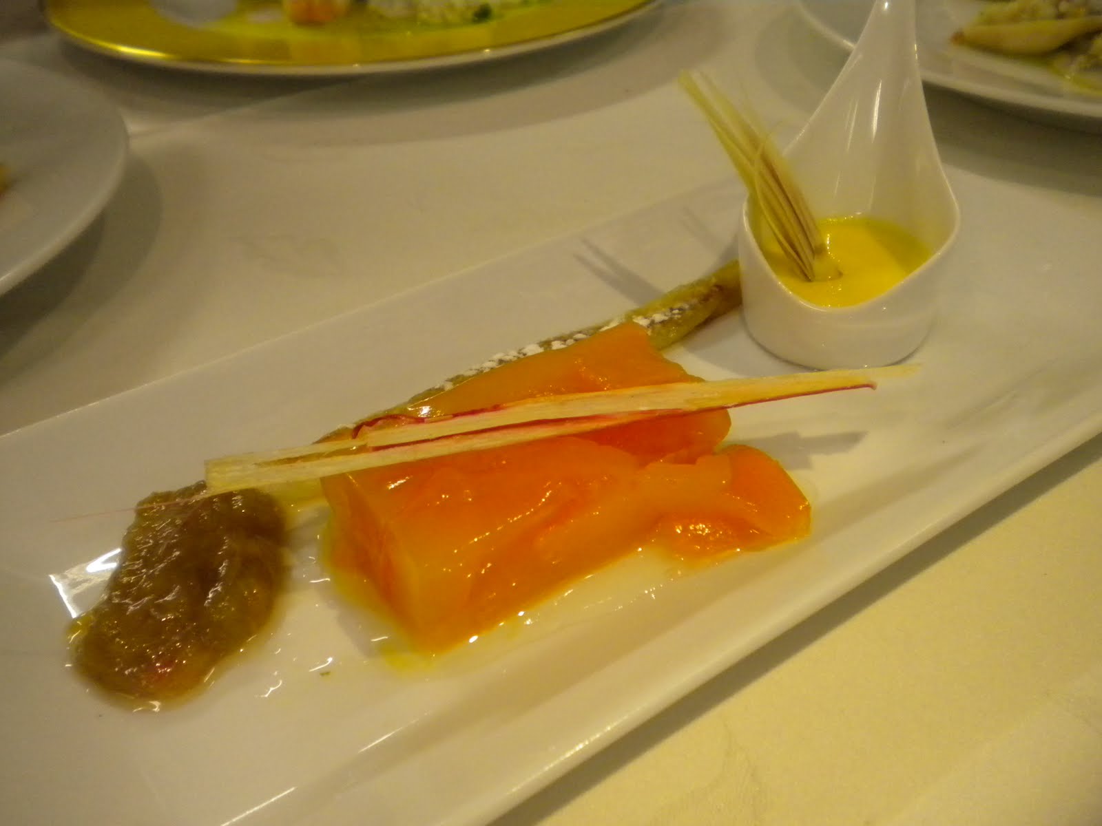 Tuesday; Tasting of the fois gras terrine chef made last week (not bad!), dorade poêlée, encornets farcis au risotto de langoustines et coriandre, and for dessert a lemon grass cream with a citrus jelly and a rhubarb crips. Nice! And sweet....