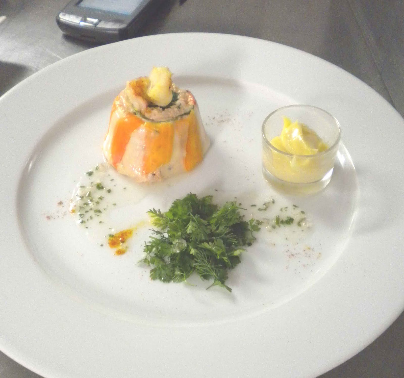 Chartreuse de saumon et gambas, mayonaise de poivron rouge, un salade aux herbs avec une vinaigrette de échalotes.
