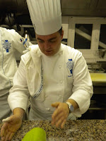 Later during the demo, Ms.D from Peru went out; noisy ! Later, he (indeed) came back in class with many of his 'gestures' and he just didn't shut up. Chef didn't like it at all and it actually pissed him off quite a bit. So he made a comment (with the same 'gestures' ) to ms.D. and told him to behave. Laughter all over.
