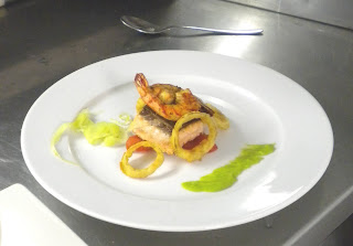 This one was OK, not really spectacular, but OK/good. My pigeon was slightly overcooked and I should have served the peas in the tomato as a puree inside it, not as whole peas. (And I did some therapy during the atelier - I shelled the peas AND I took the skin of the things.... )