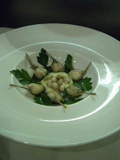 The starter, the little legs, was quite good, except for the garlic puree, that was a bit too much for me; There's not much meat at all on a frog, so you can actually only use the thighs of kermit. But chef also served it's shins.... From the rest (bones) you make 'just a sauce or jus'.
