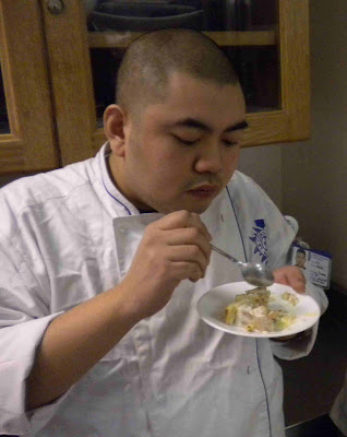 Anyway, chef started late and finished very late. He also blamed it on 'silly Peruvian' questions.... and he gave us a lecture on 'NOT being on time in class'; There are too many students already losing too many points. (You are allowed 6 absences; some are on 4 already!). Chef explained the consequences of all of this in detail... and he was quite right actually. With 53 people in class it's pretty full; This is my view on the demo kitchen today.