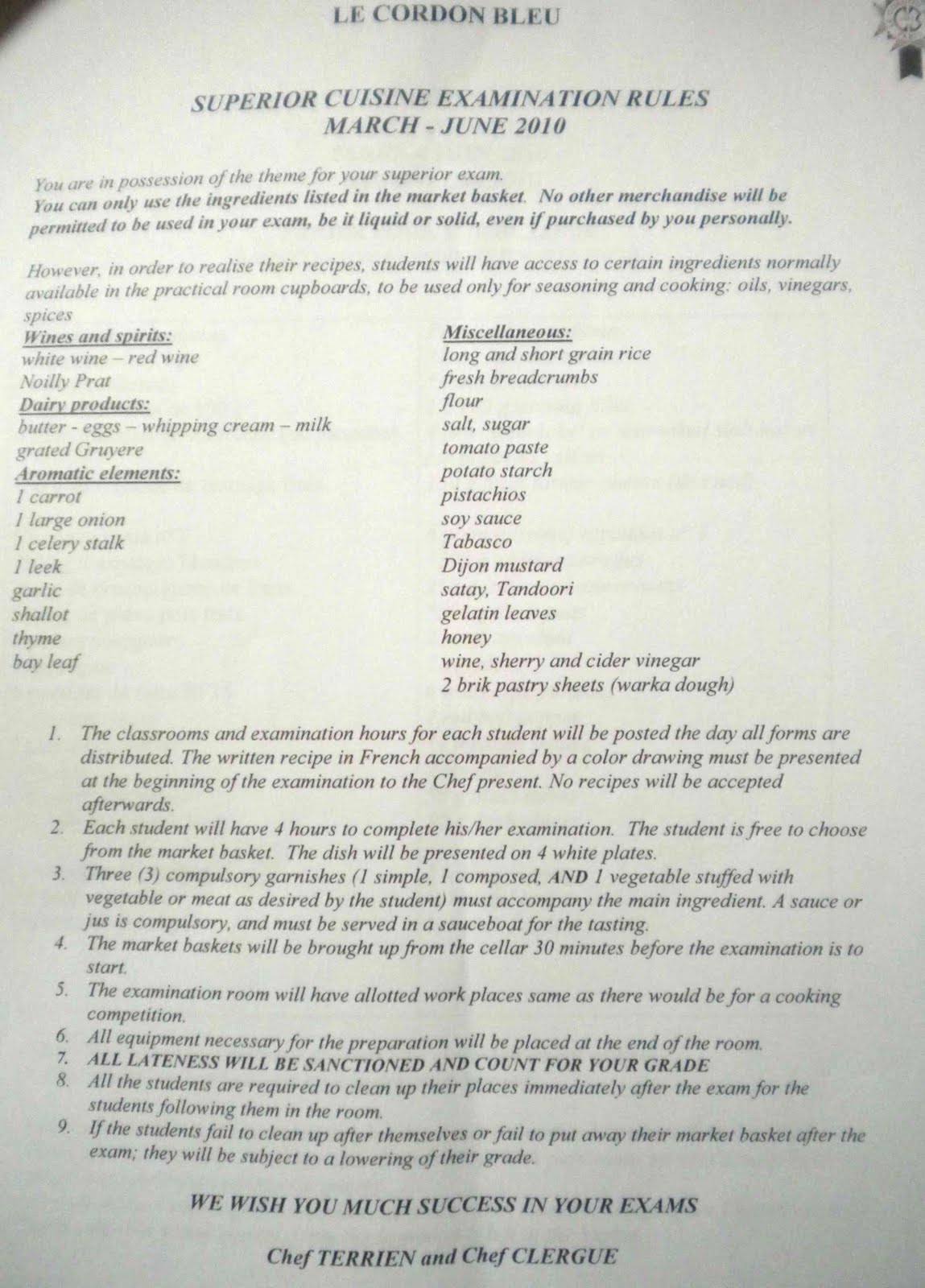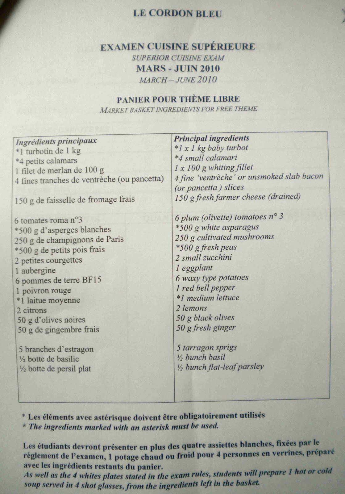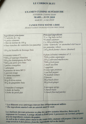 We have to make 3 garnishes, including a farce (stuffing) and a sauce or jus for the main dish. And, what's NOT on the list, is NOT available (like balsamic).